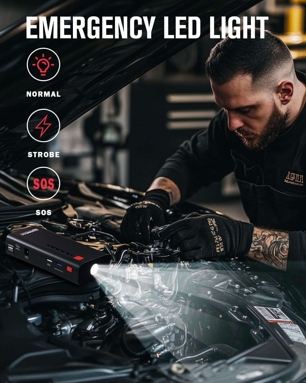 - LED WORK LIGHT: Not only a 12v portable car battery charger jump starter, the super bright LED work light has 3 modes: Flash Light, Strobe Light and SOS Light. This multipurpose flashlight is great for camping, travel, power failures, emergencies, etc.