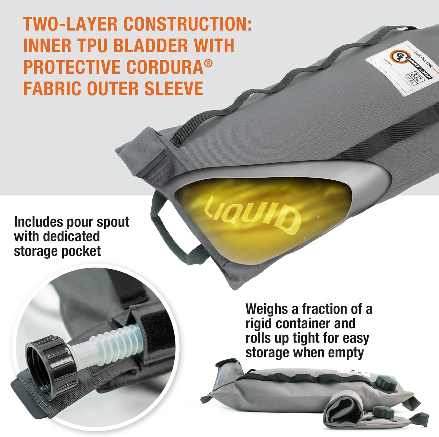 - DURABLE MATERIAL: Employs a two-layer construction, including an RF-welded inner bladder that’s protected by a highly abrasion resistant sewn Cordura outer sleeve; The bag also features webbing and rubber-molded handles that make filling and installing the pour spout and dispensing liquids easier