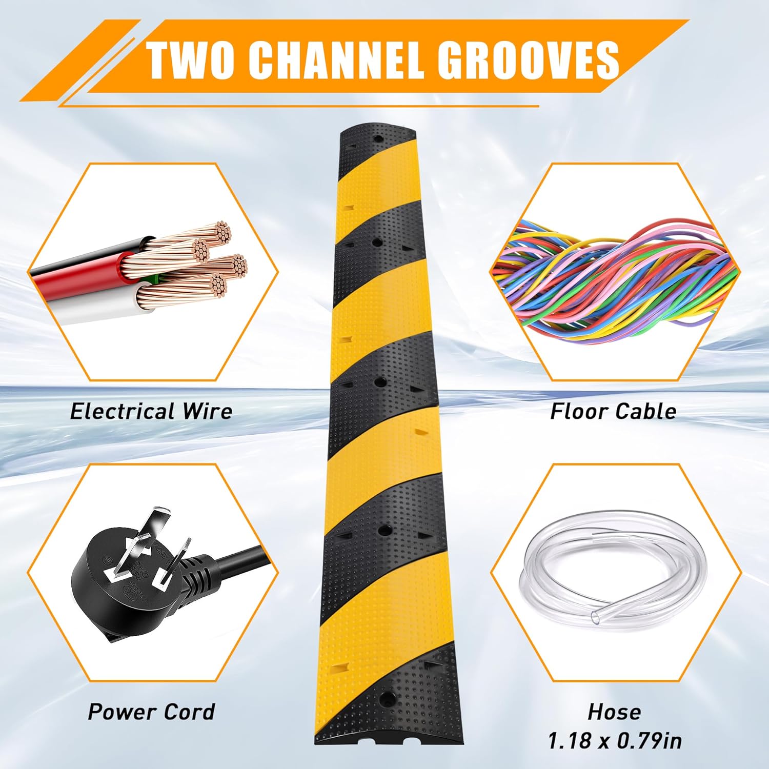 - 2 PACK 2 CHANNEL-Two speed bumps are included, single product size: 39.3"x11.81"x 2.36". The individually designed channel of the speed bump effectively protects extension cords, power cords, and hoses from pedestrians and vehicles