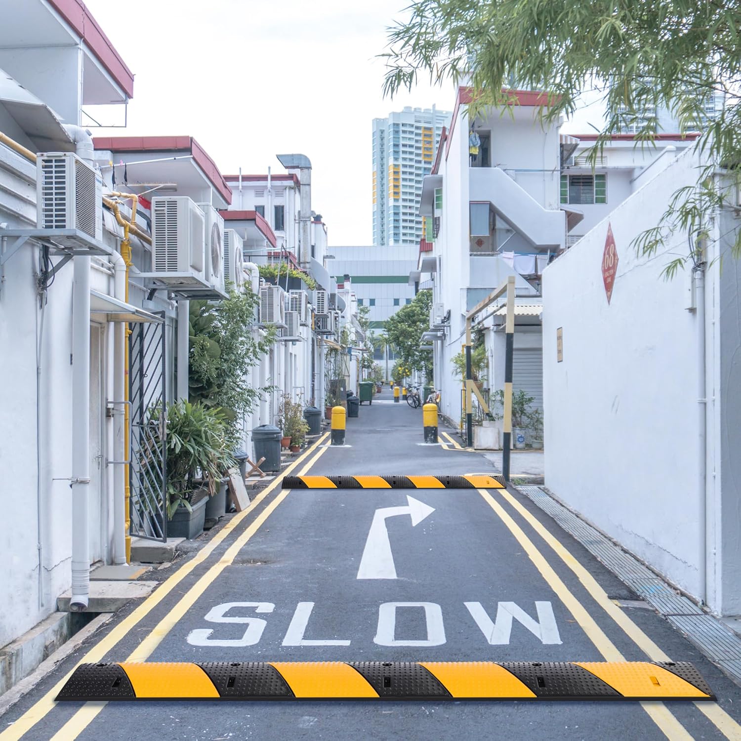 - SAFETY DESIGN-Speed bump has a non-slip surface texture, and it is not afraid of slipping on rainy and snowy days. The eye-catching black and yellow colors warn vehicles to slow down in advance and enhance passers-by's sense of safety