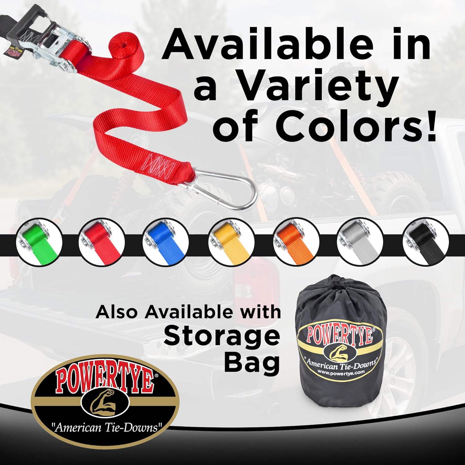 - MADE IN USA QUALITY: PowerTye MFG has been proudly making tie-down and ratchet straps in Anaheim, California since 1991. Many have tried to imitate our Original Designs for Tie-downs, Ratchet Straps, Cargo Nets and other products, but none can match our American Quality, Performance, Value or Exceptional Service. For all your Motorcycle, ATV, UTV, Watercraft and Cargo hauling needs, trust American manufacturing. Trust PowerTye.